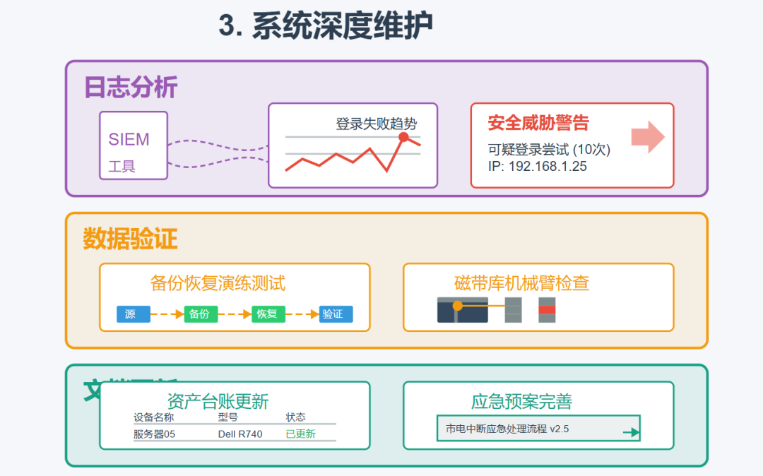 数据验证:通过恢复演练测试备份数据可用性,确保数据丢失时能快速还原;检查磁带库机械臂运行状态,保障备份数据安全存储。