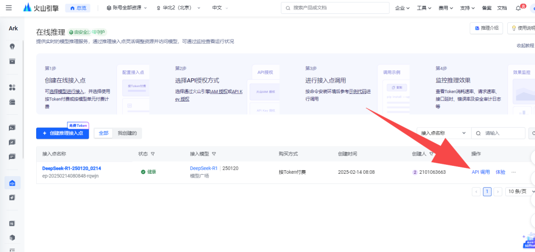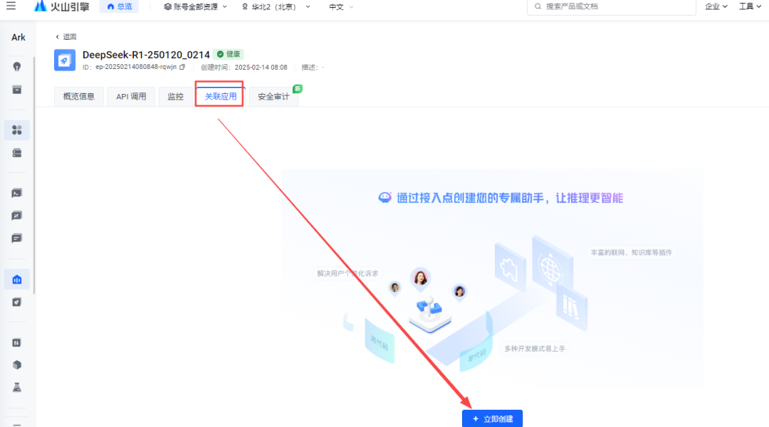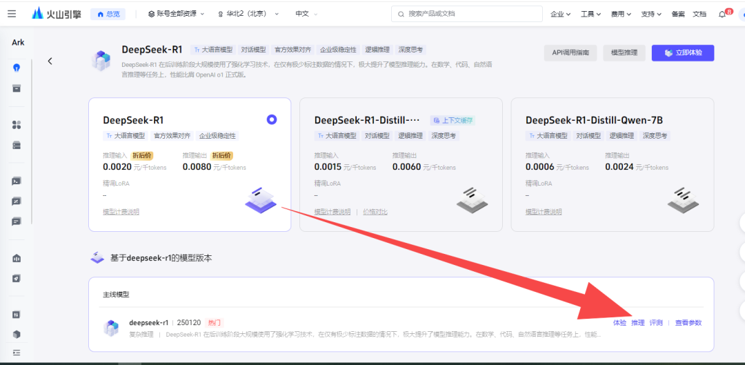 1.访问火山引擎DeepSeek R1模型页面:https://console.volcengine.com/ark/region:ark+cn-beijing/model/detail?Id=deepseek-r1