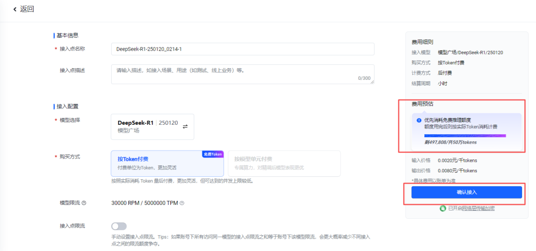 直接点击【确认接入】(目前平台提供50万免费token,超出后享受限时半价优惠)