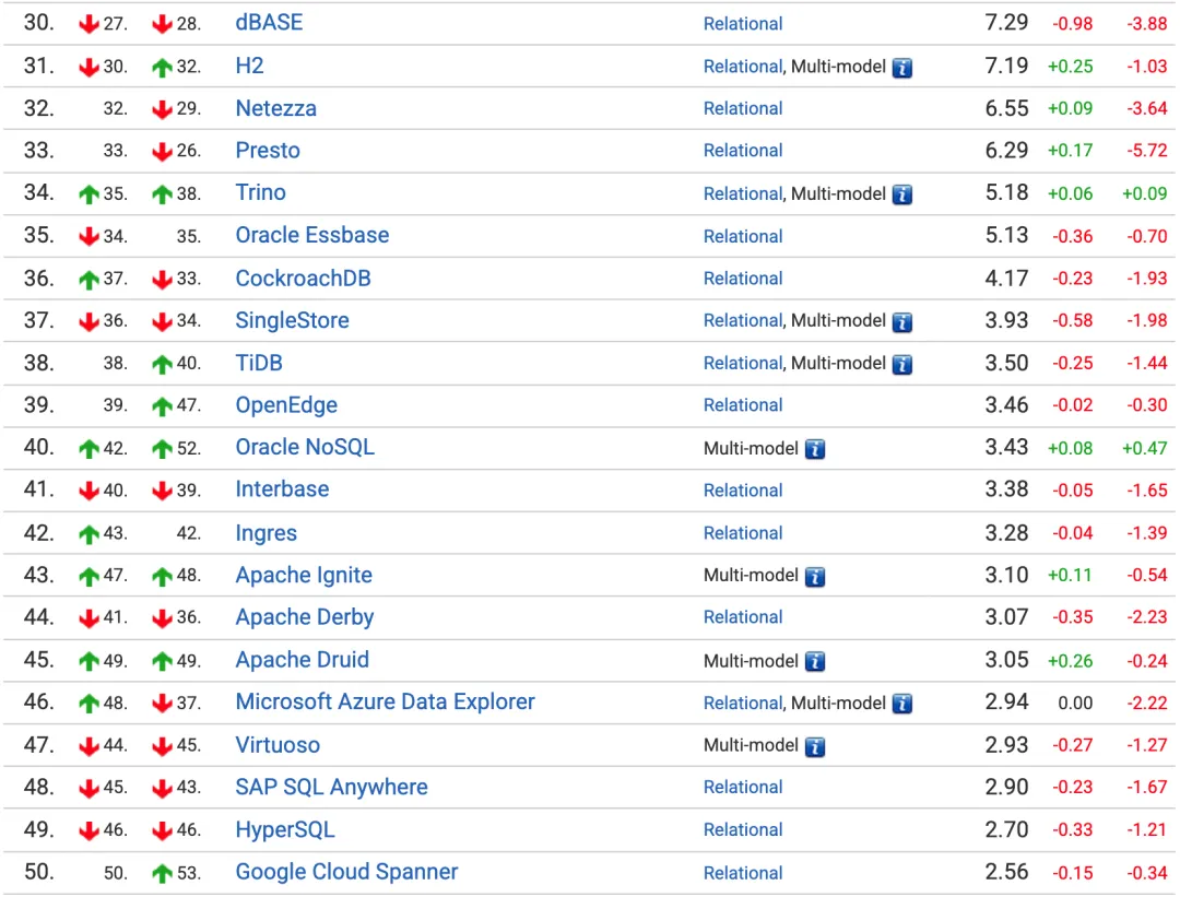 2019 年 , TiDB 刚进入 DB-Engines 排名时,全球排名大约在 150–160 区间 。 最新数据显示, TiDB 已成功跻身 DB-Engines 全球数据库总榜前 100 名,在关系型数据库中也取得了较为亮眼的成绩 , 排名 38 位,仅次于 Singlestore,比 Google Spanner 还高出 10 多个名次 ,表明 TiDB 已经进入国际领先数据库行列。
