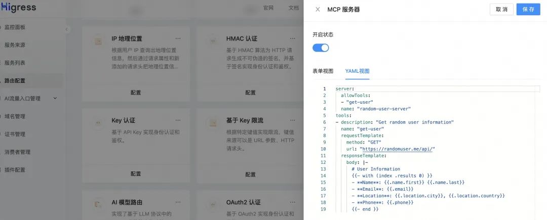 接下来我们将生成的文件导入 Higress 控制台,并添加 MCP Server 插件并进行配置,就可以将其与 Higress 一起使用。