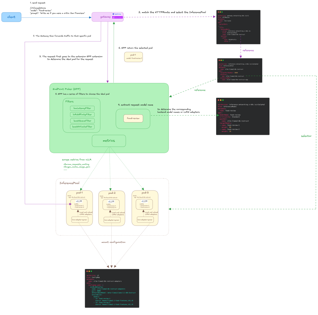 Gateway API Inference Extension: https://gateway-api-inference-extension.sigs.k8s.io/ Gateway API: https://gateway-api.sigs.k8s.io/ ext-proc: https://www.envoyproxy.io/docs/envoy/latest/configuration/http/http_filters/ext_proc_filter InferencePool: https://gateway-api-inference-extension.sigs.k8s.io/api-types/inferencepool/ InferenceModel: https://gateway-api-inference-extension.sigs.k8s.io/api-types/inferencemodel/ EndPoint Picker (EPP): https://github.com/kubernetes-sigs/gateway-api-inference-extension/tree/main/pkg/epp Dynamic LORA Adapter Sidecar: https://github.com/kubernetes-sigs/gateway-api-inference-extension/tree/main/tools/dynamic-lora-sidecar Implementations: https://gateway-api-inference-extension.sigs.k8s.io/implementations Deep Dive into the Gateway API Inference Extension: https://kgateway.dev/blog/deep-dive-inference-extensions/ Smarter AI Inference Routing on Kubernetes with Gateway API Inference Extension: https://kgateway.dev/blog/smarter-ai-reference-kubernetes-gateway-api/