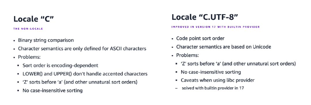 许多程序员对于 Locale/Collation 规则都不太了解,但它确实是一个相当重要的东西。 使用不当的 Collation 配置不仅可能带来几倍的性能损失,还可能导致数据不一致,甚至是数据丢失。 是的没有错,索引与排序规则紧密相关,Collation 不是什么无关紧要的配置。关于这个主题,我强烈推荐感兴趣的朋友阅读 PG 中的本地化排序规则[2]一文, 以及 PGCon.Dev 2024 Jeremy Schneider 的 PPT 分享: Collations from A to Z, Putting words in order without losing your mind or your data[3]。