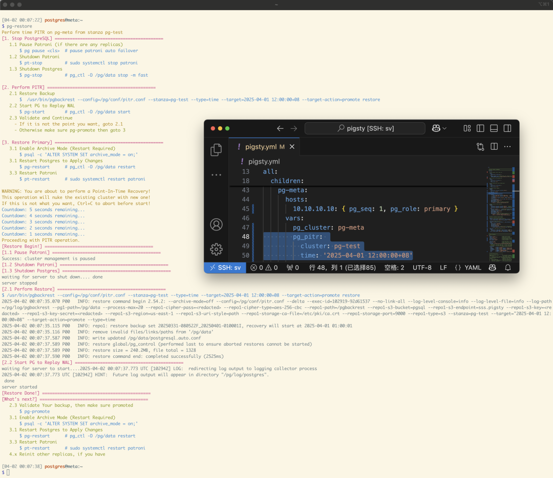 你可以使用更加 Ansible 原生的方式来实现这一点。 当你在 PG 集群上定义 pg_pitr[4] 参数时, Pigsty 会自动生成用于恢复的 /pg/bin/pg-restore