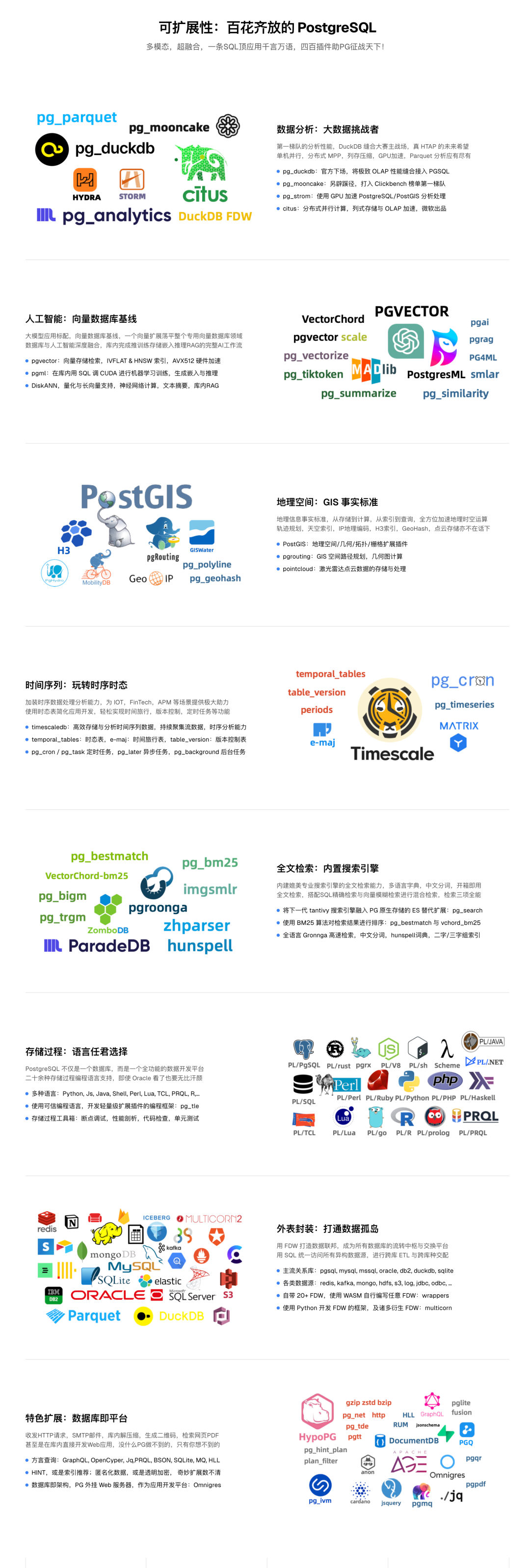 在过去的几个版本中,Pigsty 主要关注 PostgreSQL 扩展生态,在持续一年的扩张中,我已经收录了 PG 生态中几乎所有能打的扩展 —— 数量高达 404 个。