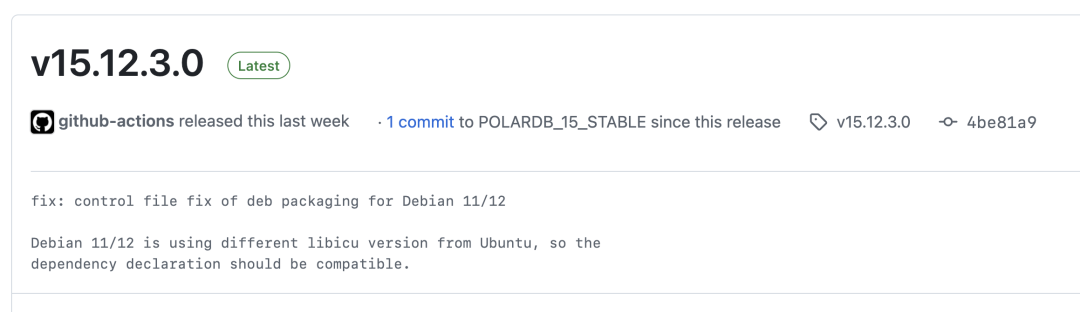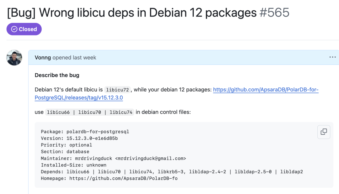 当然这里我还要顺带批评下 PolarDB,打包 DEB 也不认真,打出来的 Debian 包 libicu 版本依赖写错了,根本装不上,让人感觉根本没测试过。但好在他们的响应速度还是挺快的,在我反馈这个问题之后很快就重新发布的新的修复版本[5]。