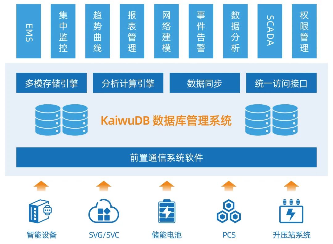 为了有效解决储能场景下数据管理瓶颈,KaiwuDB 基于其分布式多模架构底座,对接 EMS 及 SCADA 系统,可实现储能电站上亿级实时/历史数据的采集、存储、处理、分析、发布和快速检索等能力。