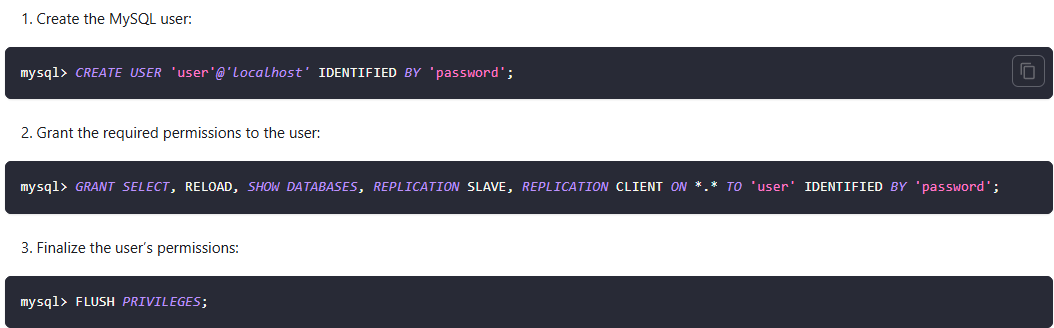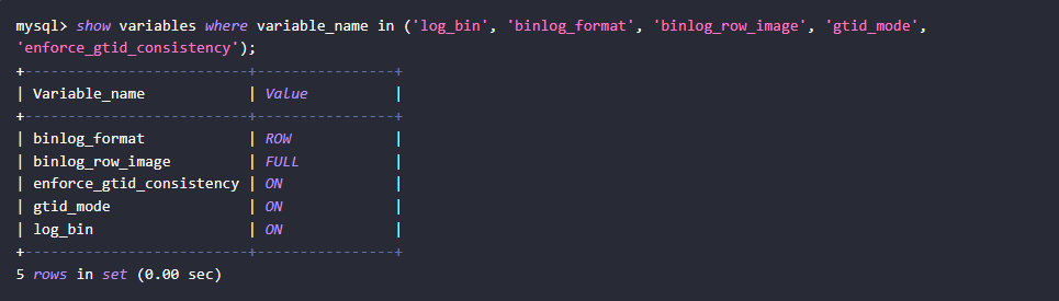 GRANT SELECT, RELOAD, SHOW DATABASES, REPLICATION SLAVE, REPLICATION CLIENT ON *.* TO 'cdc_user'@'%';