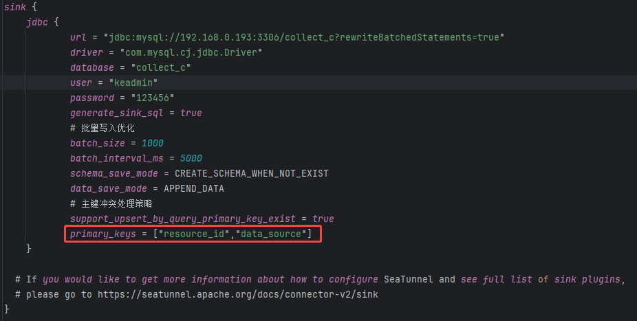 本次开启了该功能,用于支持主键冲突时的更新。 primary_keys:指定写入数据的主键