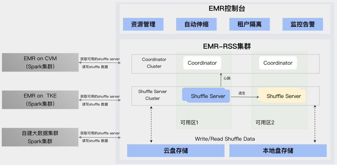 社区Uniffle通常需要预先配置固定资源池,而自研EMR-RSS集群架构实现: