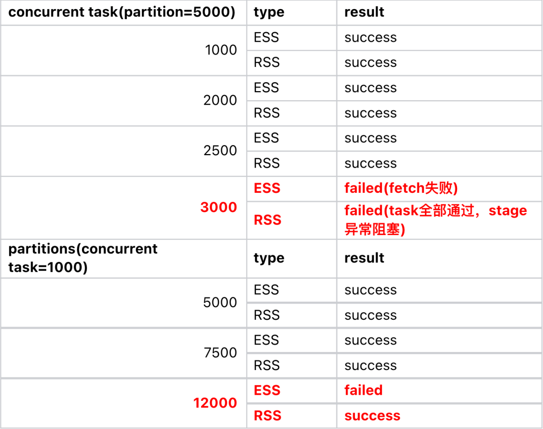在任务并行上,RSS和ESS的性能相近,但是RSS的配置远低于ESS,在部署方式进一步简化之后,可以尝试试探更大集群的RSS并行瓶颈;在数据分区上,RSS表现出更优的性能,可以运行更高分区的数据进行shuffle。