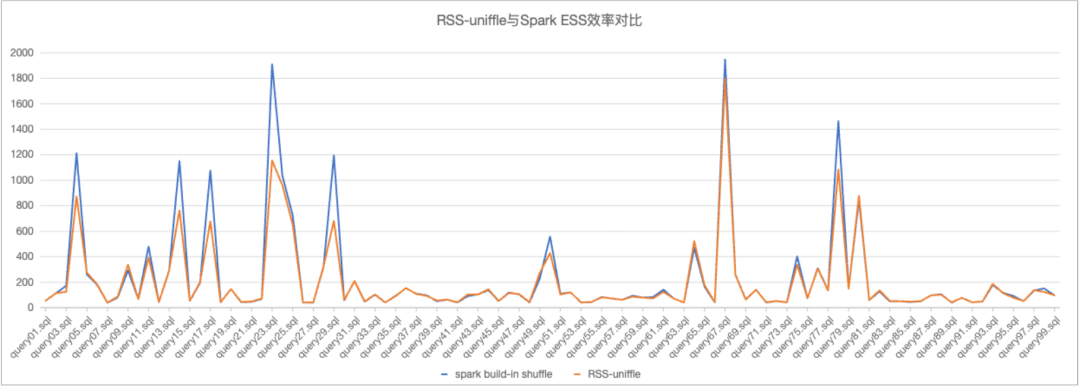 在10T规模数据下,使用Uniffle作为RSS相比于Spark ESS,执行效率提升约13.85%,成本提升在10%左右。不难发现RSS在用时较长的用例中基本全部快于ESS,在超过500s的用例中,这个优势相当巨大,而在用时较短的用例中,也就是Shuffle数据较少时,RSS慢于ESS,此时网络传输等其他因素的影响更大。