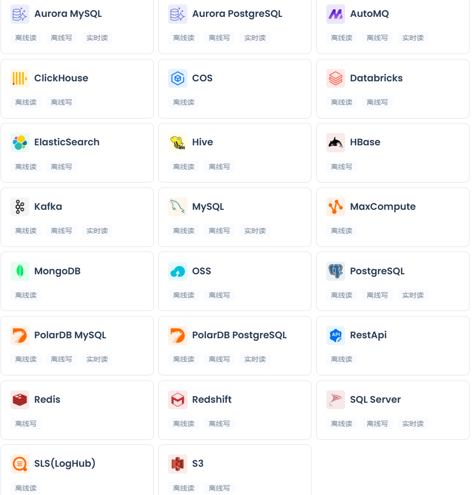 云器Lakehouse预集成50余种异构数据源连接器,涵盖关系型数据库、文档数据库、键值存储、消息中间件及对象存储等主流数据系统,通过可视化操作界面实现多源异构数据的离线批量采集与实时流式同步。
