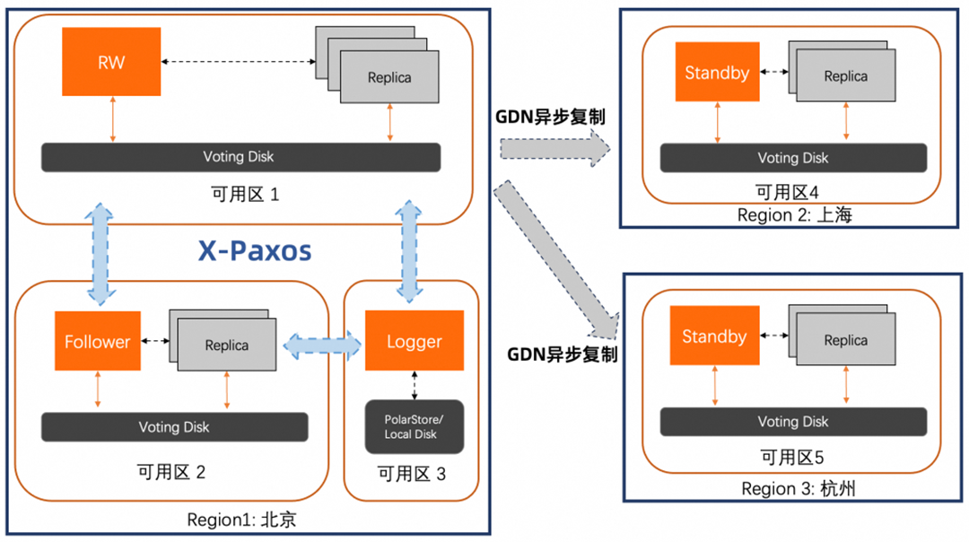 多可用区数据强一致性。与半同步和异步方式相比,采用一主一备一日志的三节点架构,通过物理复制与X-Paxos协议相结合,同可用区之间强同步物理日志,在进行可用区切换时可保证零数据丢失。