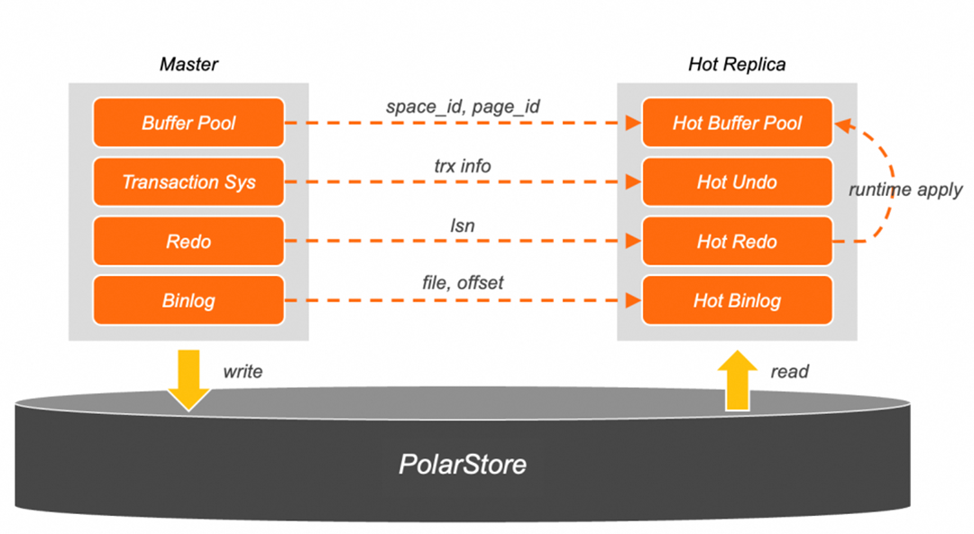 PolarDB通过多技术协同实现高可用与无缝切换。热备RO节点除提供读服务外,预留部分资源作为全局预热系统,通过Buffer Pool、Undo、Redo、Binlog四个模块实时同步主节点元数据至内存。当主备切换发生时,备节点可以直接从内存获取到相关信息而不用通过发起IO从存储获取信息。