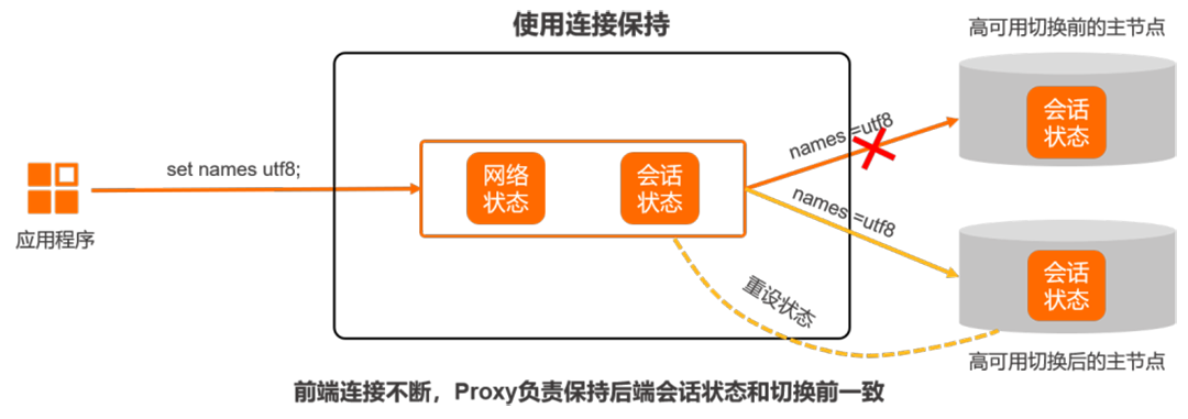 传统主备切换常导致连接中断和事务回滚,针对空闲连接,PolarDB连接保持功能通过数据库代理(PolarProxy)在应用与数据库间桥接连接,切换时保留会话状态(如变量、字符集),保证连接不中断。