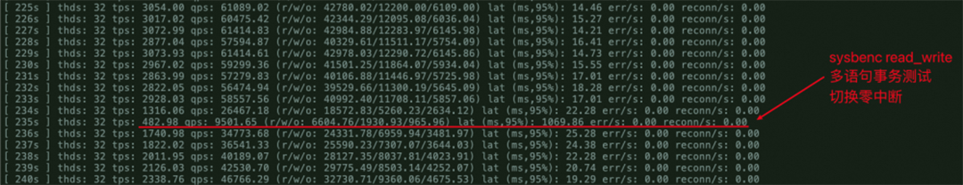 通过sysbench read_write 32并发测试,验证主备切换的效果。如图6所示,可以看到在切换瞬间,只有1秒多慢查询影响,无断连报错。
