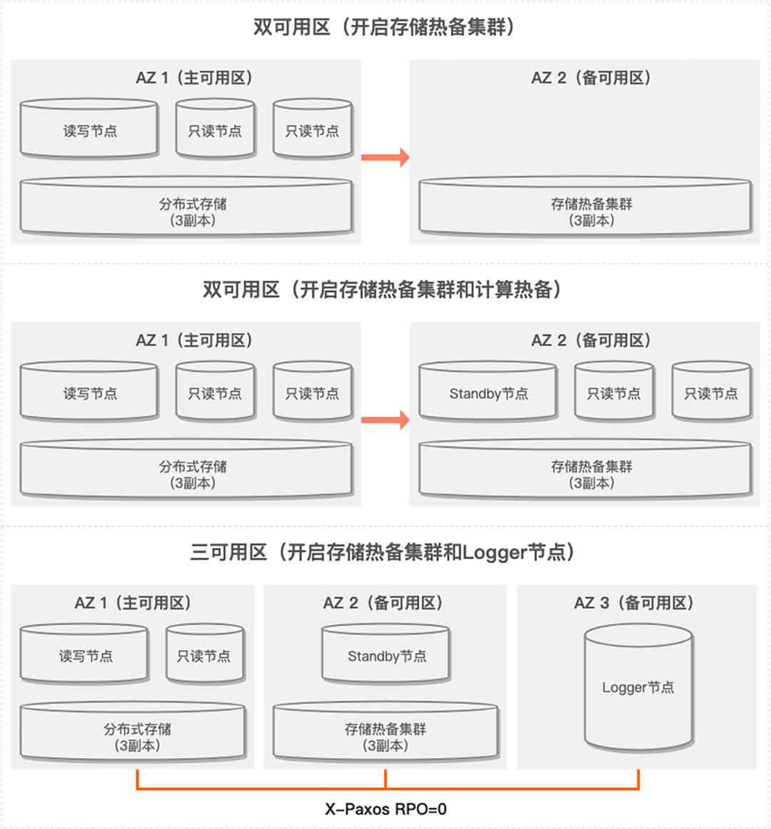 当需要在同城不同可用区之间进行数据容灾时,PolarDB提供多层次的容灾体系以供选择。