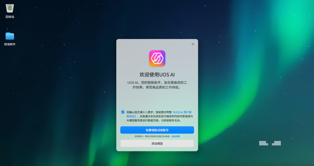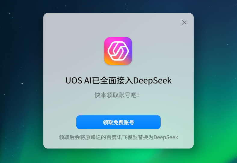 老用户更新完成后,首次打开 UOS AI 助手,即可点击弹窗按钮领取 DeepSeek 账号。