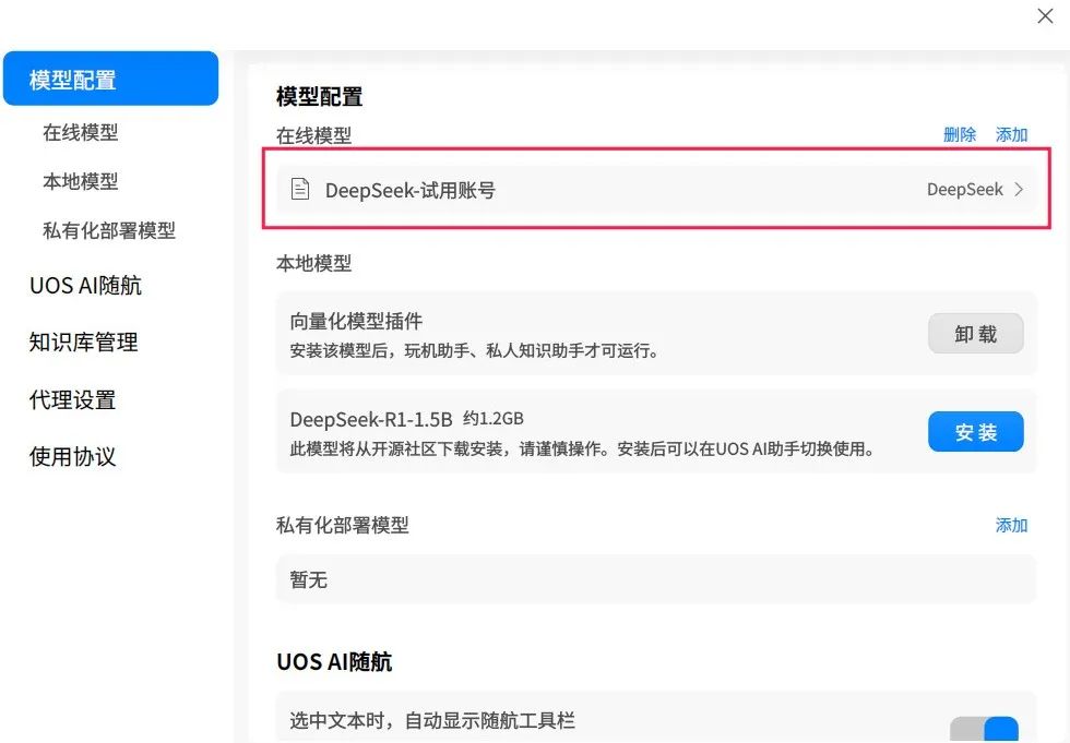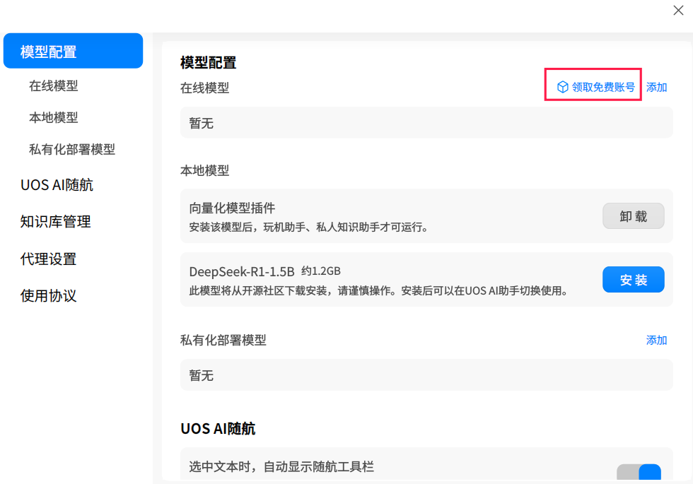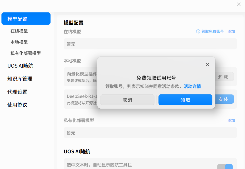 账号领取完毕,UOS AI 将默认使用 DeepSeek 作为引擎,赋能所有 UOS AI 功能,如 UOS AI 助手、AI 随航、AI 写作等。