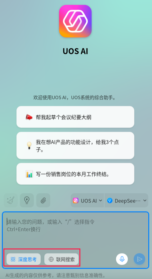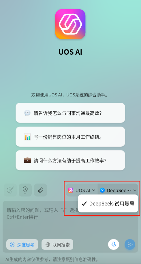 使用 UOS AI 助手,可在下方选择“深度思考”和“联网搜索”功能,打开深度思考调用 DeepSeek R1 模型,关闭深度思考则调用 DeepSeek V3 模型,适配更多使用需求。