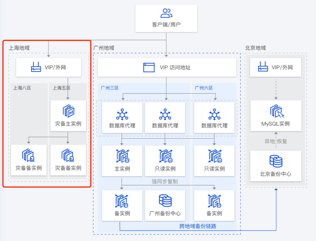 1、正常情况下:主实例承担生产流量,提供读写能力,其灾备实例正常数据同步,只提供灾备能力,跨地域备份文件根据自动备份生成周期而自动异地保存,其保存时长客户可以自行调整。
