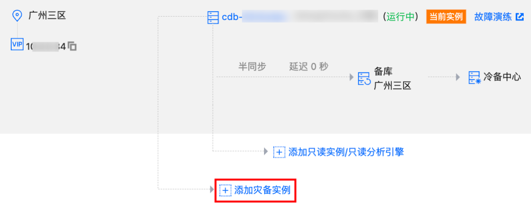 在实例架构图中单击添加灾备实例,即可创建跨地域灾备