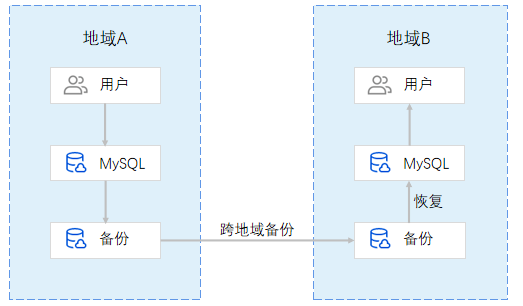 跨地域备份的这种方式无须重新拉起一个新的数据库做数据实时同步,仅需将原数据库的备份复制一份保存在跨地域备份系统,当实例所在地域发生自然灾害或故障无法恢复时,即可通过跨地域备份系统的备份进行异地恢复。