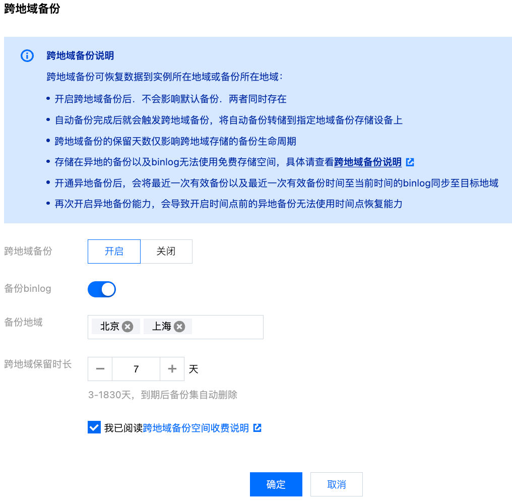 在控制台选择备份恢复 > 跨地域备份。在跨地域备份设置窗口可选择备份地域、保留时长,单击确定开启跨地域备份。