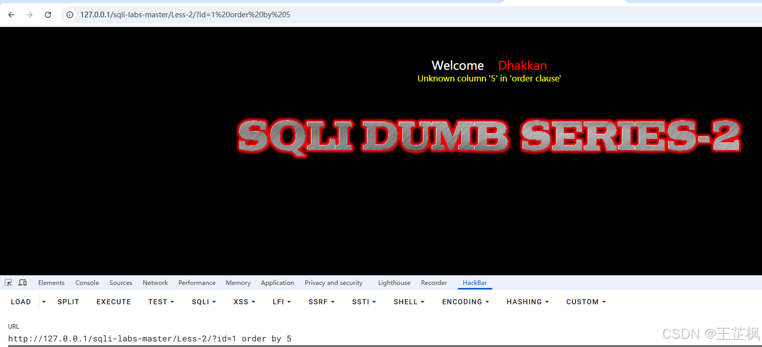 接着按F12或者右键页面点检查进入控制台界面,并使用HackBar插件,load加载此时的网页,并输入order by 数字 查看存入该数据库的表中有几个字段,也就是多少列。一个一个试错,这里发现5列是报错了,说明实际没有5列,在5列一下。通过试错发现该表的字段一共就3列。