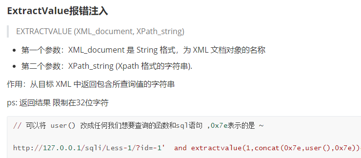- ExtractValue函数,共有2个参数,返回的字符限制在32位,也就是说最多只能显示出32位字符,用concat()函数来触发报错,从而获得我们想要的东西。