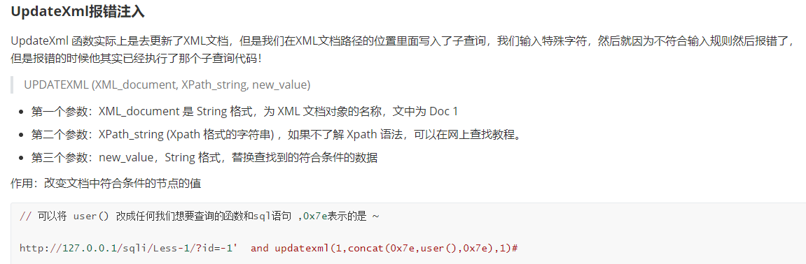 - UpdateXml函数,共有3个参数,同样用concat()函数来进行报错。