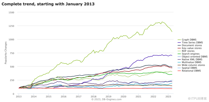 根据DB-Engines的数据,图数据库是近十年来最受关注的数据库类别,目前DB-Engines收录了39款图数据库。