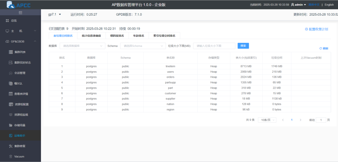 表垃圾空间:快速识别因频繁更新/删除导致的存储浪费; 统计信息准确度:定位因统计信息过期而引发的查询性能瓶颈; 数据倾斜度:发现分布不均的分区表,优化资源利用率; 表年龄与索引垃圾空间:预防长事务阻塞与索引碎片化问题。通过多维度的实时监控,运维团队可主动优化数据库性能,将风险扼杀在萌芽阶段。