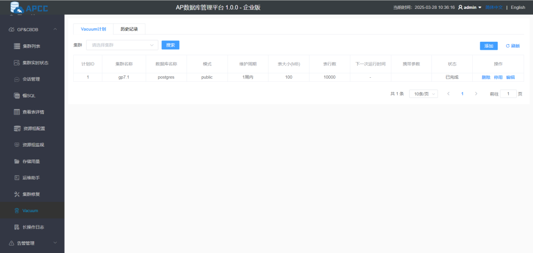 灵活配置清理策略:支持按数据库模式级别设置清理频率,并可指定在业务低峰期自动执行; 空间回收与性能优化:通过定期清理死元组,有效释放存储空间,提升查询效率,同时避免清理操作对在线业务造成冲击。