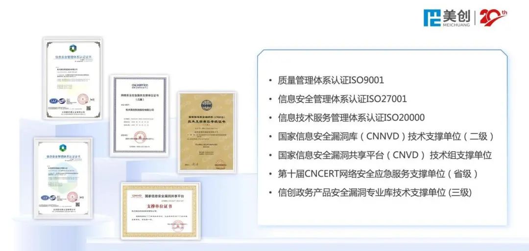 坚持服务能力提升,从ISO9000、ISO27000体系完善到漏洞挖掘、应急响应服务能力持续提升,致力于为客户提供更可靠、更优质的服务体验 。