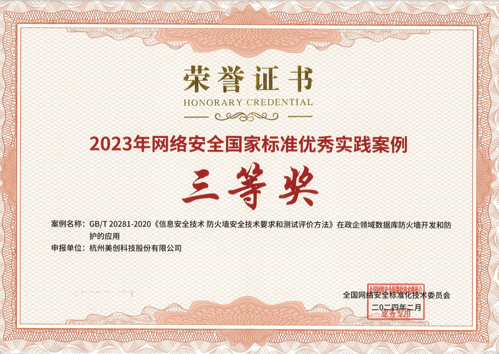 二十载深耕不辍,美创科技积极投身国家、行业数据安全标准制定工作,深度参与超 30 项相关标准的编制,覆盖数据库审计、数据库防火墙、数据备份、政务信息共享等关键领域。凭借在标准实践方面的卓越成效,荣获2023年网络安全国家标准优秀实践案例三等奖。