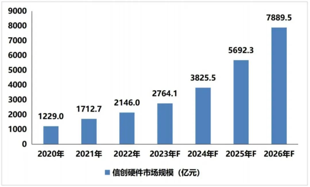 根据赛迪数据,2023年中国信创产业从党政、关基向民用领域进一步拓展,市场空间加速释放,预计2026年将达到7889.5亿元。庞大的市场规模反映出信创硬件市场的繁荣前景,与此同时,随着信创行业开始朝着“2+8+N”迈进,“大信创”新格局初具雏形,部分行业发展隐患也逐渐浮出水面。