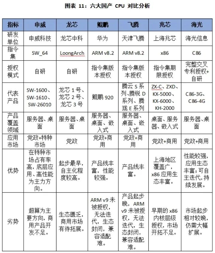报告深入分析了信创硬件上下游产业链发展情况,并梳理出当前主要技术路线及相关厂商,对产业发展趋势和风险给出关键建议,从供给侧来看,在信创CPU领域,六大国产CPU指令集授权模式、产品覆盖领域及应用市场存在差异,且各有优劣势。