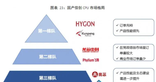 而在市场端,国产CPU已逐步形成三大梯队。报告显示,海光、鲲鹏目前在信创PC市场订单充裕,市场占有率相对较高,位于第一竞争梯队;龙芯凭借自主可控优势在党政领域竞争力较强;飞腾在商用市场也逐渐发力,但可持续发展能力较弱,位于第二竞争梯队;兆芯、申威各有竞争优势,但也存在发展短板,信创硬件市场份额相对较小,位于第三竞争梯队。