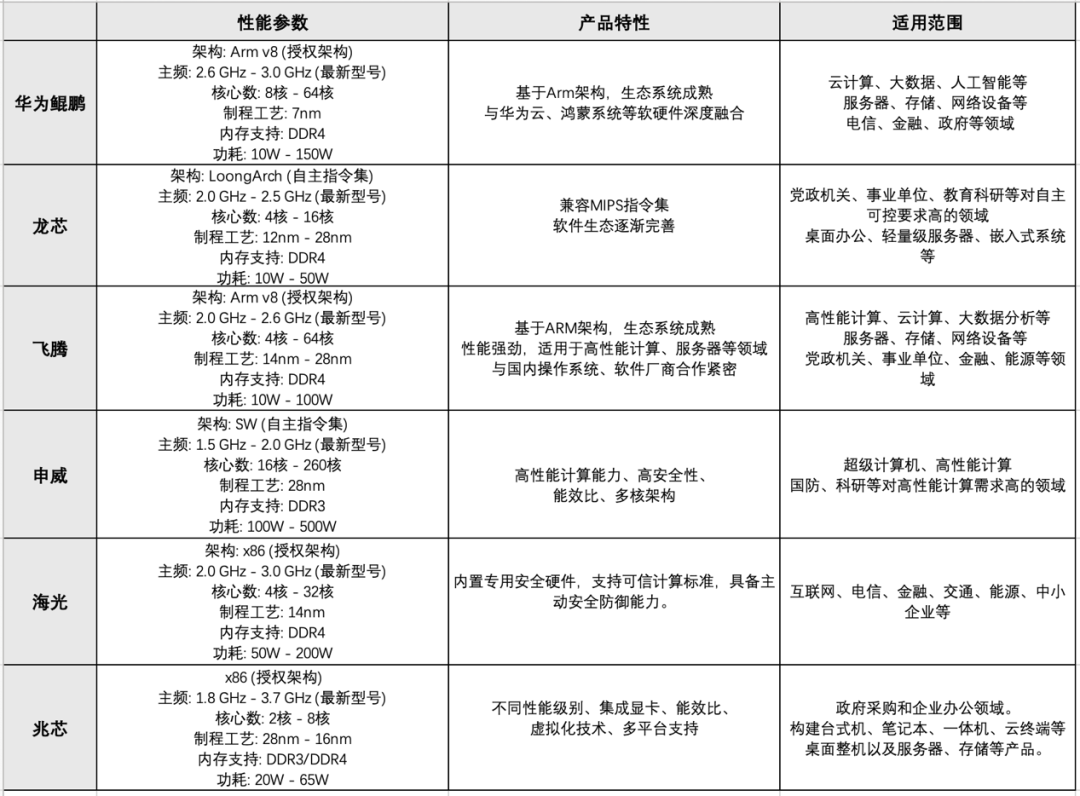 ▍ 处理器架构方面,国产CPU呈现出多样化的特点。海光和兆芯则采用x86架构,生态兼容性好;龙芯基于自研的LoongArch指令集,强调自主可控;飞腾和华为鲲鹏则基于Arm架构,兼容全球Arm生态;申威处理器则使用自研的申威64位指令集,针对特定应用场景进行优化。