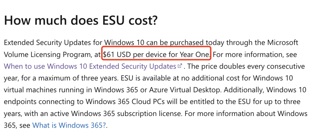 如果你是 Windows 企业版用户,第一年收取的费用为每台设备额外支付 61 美元,此后,价格会每一年翻一倍,最多持续三年,即第二年费用翻倍至 122 美元,第三年则进一步增加至 244 美元。