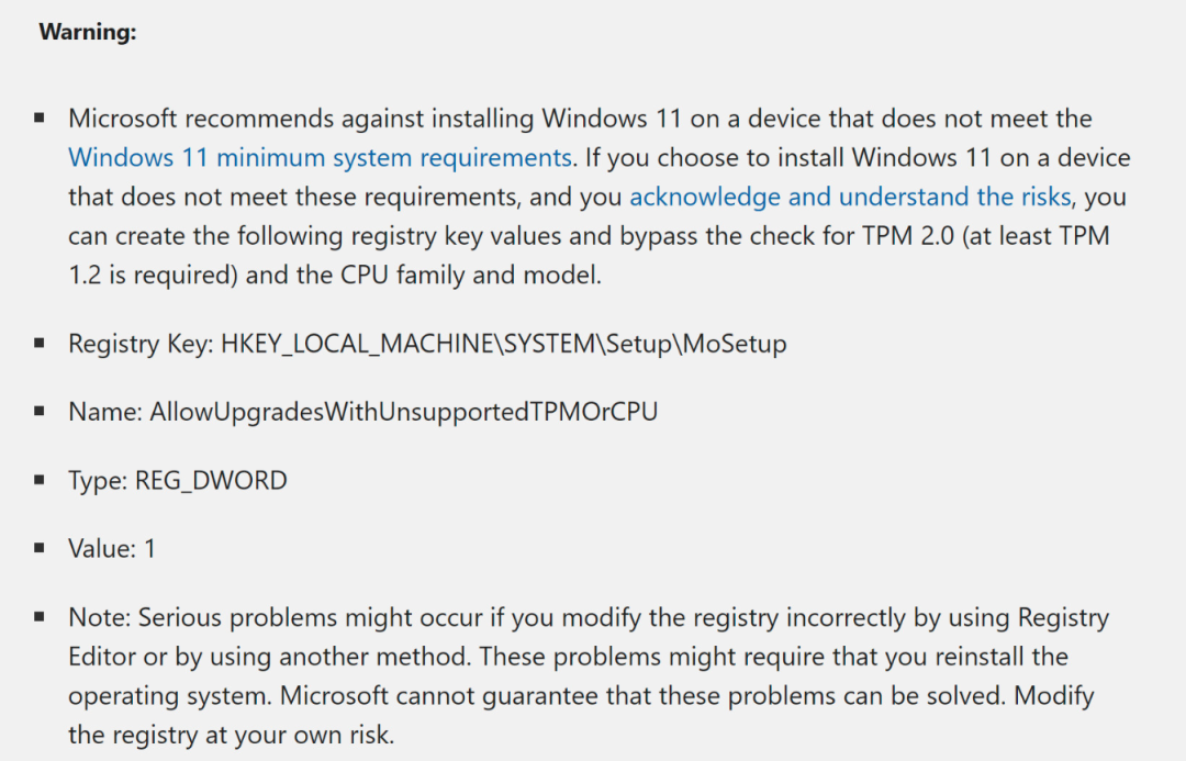 具体操作包括创建一个注册表项,通过绕过 CPU 和 TPM 检查,允许在不支持的 PC 上升级 Windows 11。微软在支持文档中虽然警告用户修改注册表可能带来的风险,但这一方法在当时为许多用户提供了升级的可能,: