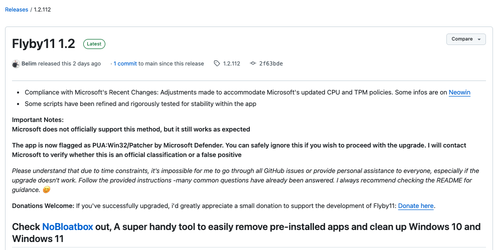 Flyby11 开发者在 GitHub 更新页面上表示,Microsoft Defender 将该应用程序标记为 PUA(潜在不需要的应用程序)。