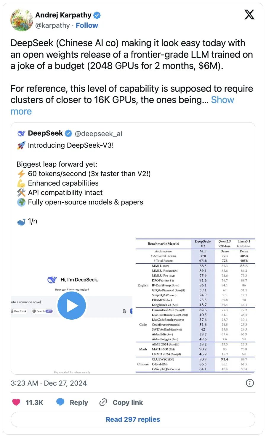 鉴于发布时间和DeepSeek-V3的讨论热度,不少人解读这是在阴阳DeepSeek。