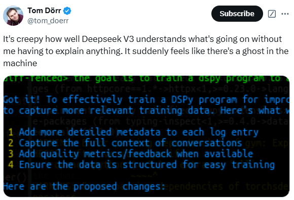 并且,第一波实测 DeepSeek v3 的用户都对其难以置信。一位用户表示,“Deepseek V3 在我不需要解释任何事情的情况下就理解了正在发生的事情。”